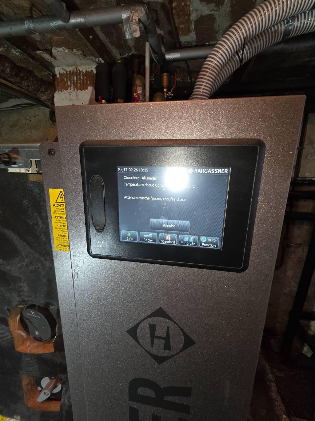 Nous sommes intervenus à Chevregny proche de Laon pour l’entretien annuel d’une chaudière à granulés Hargassner Nano PK12, avec une opération particulièrement approfondie sur le système d’évacuation des fumées