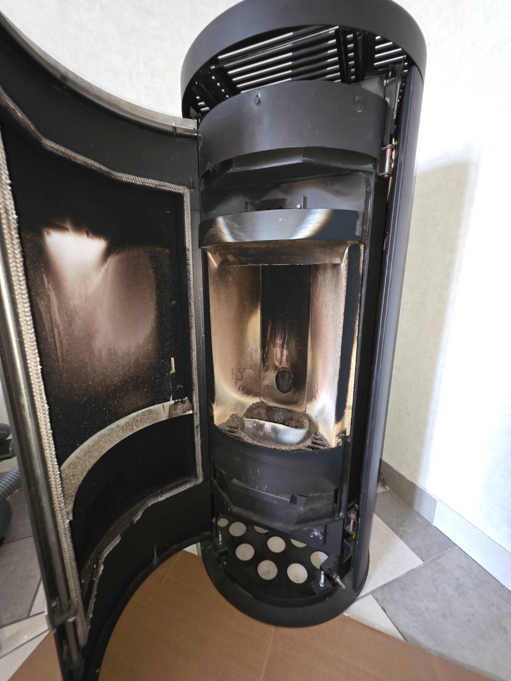 Réalisation d’un entretien complet avec ramonage sur un poêle hydro Oranier Carus Aqua 2.0 de 10 kW.